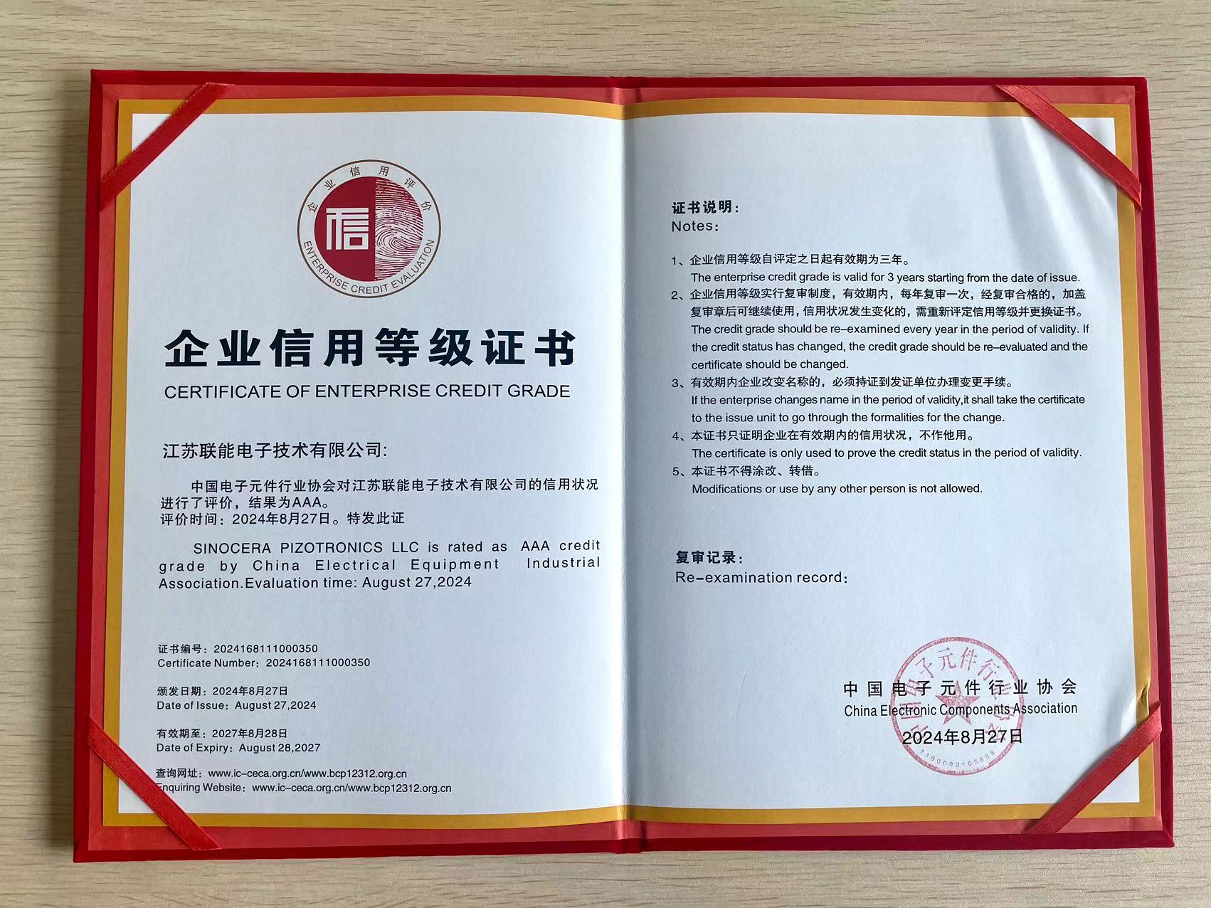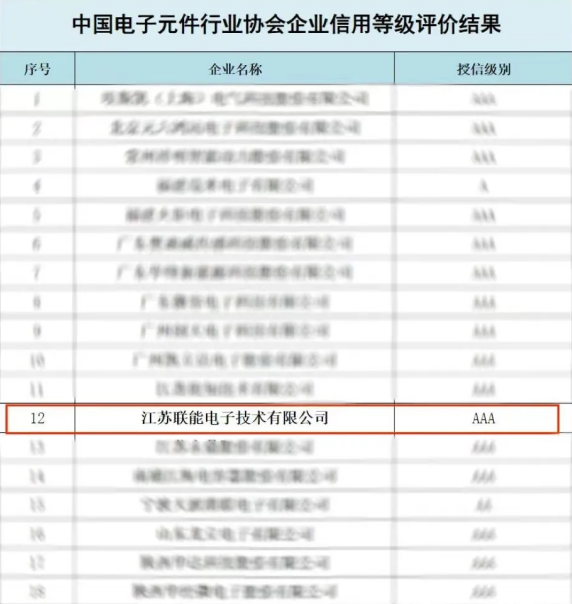 中國電子元件行業(yè)協(xié)會(huì)開展中國電子元件行業(yè)企業(yè)信用等級(jí)評(píng)價(jià)活動(dòng),旨在增強(qiáng)中國電子元件行業(yè)的誠信建設(shè),推動(dòng)行業(yè)自律。以企業(yè)基礎(chǔ)信用能力、經(jīng)營能力、管理能力、財(cái)務(wù)實(shí)力、信用記錄、行業(yè)協(xié)會(huì)評(píng)價(jià)等6項(xiàng)內(nèi)容為一級(jí)指標(biāo);以經(jīng)營業(yè)績,品牌建設(shè),質(zhì)量管理,技術(shù)與研發(fā)、償債與獲利等能力,在同行業(yè)中的地位和行業(yè)影響力等33項(xiàng)內(nèi)容為二級(jí)指標(biāo)作為評(píng)價(jià)標(biāo)準(zhǔn),經(jīng)過對(duì)這些指標(biāo)進(jìn)行嚴(yán)格、全面的分析和審核,聯(lián)能電子各項(xiàng)指標(biāo)良好,綜合評(píng)價(jià)得分進(jìn)入AAA等級(jí)。